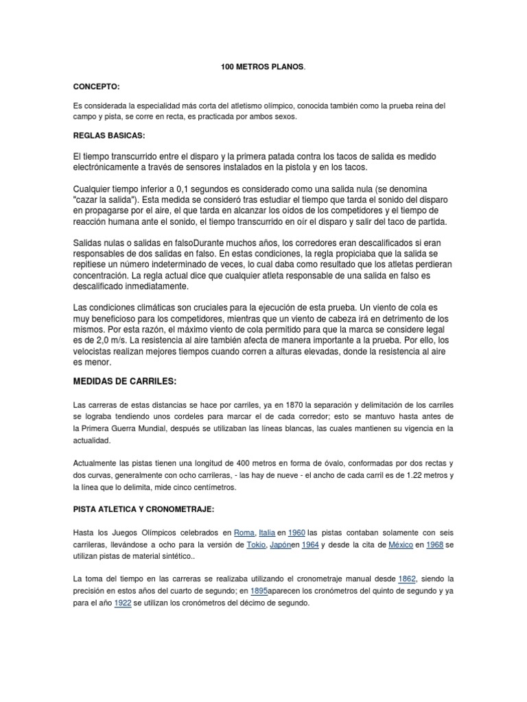 Hasta el año 2010 se permitía una salida en falso, siendo la segunda motivo de descalificación, pero a partir de ese año una sola salida en falso lleva irremediablemente a abandonar la carrera por descalificación. Los velocistas salen desde los tacos de salida. Se considera, en general, como la competición de carreras de velocidad más importante. Esta prueba es disputada tanto en pista cubierta como en pista al aire libre. Que palabras emplea un juez de salida para los corredores de 100 metros planos 2 ver respuestas en carreras superiores a 400 metros, la voz será ¡a sus puestos!, y cuando todos los.